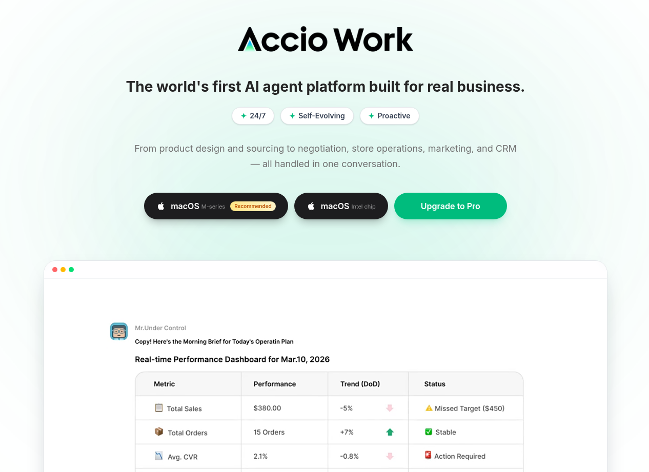 O Accio Work não é apenas um chatbot ou uma ferramenta de conversa. Ele é um time de agentes de IA que executa tarefas reais para você, focado em negócios como vendas, e-commerce, CRM e marketing automático. Tudo isso roda localmente no seu computador, o que garante mais segurança e rapidez.