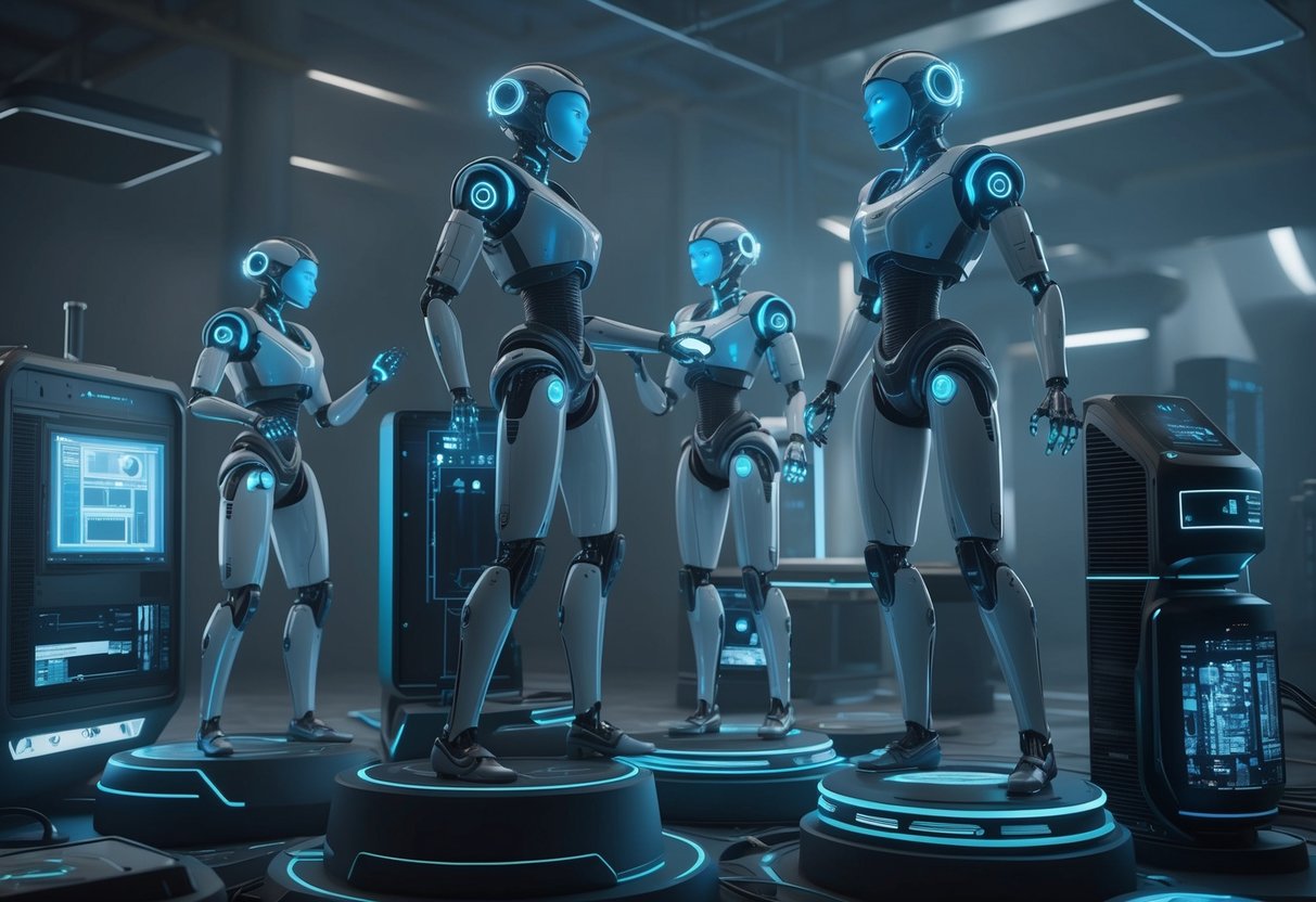 Um grupo de agentes autônomos interagindo com vários dispositivos e sistemas, demonstrando suas capacidades e funções em um ambiente de IA